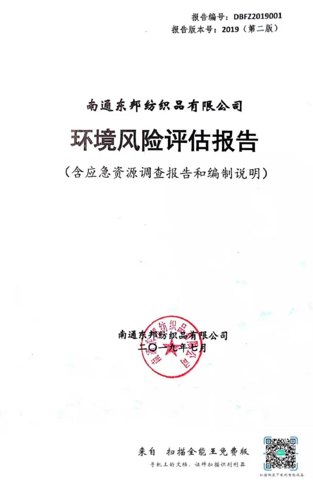 南通東邦紡織品有限公司按照《突發(fā)環(huán)境應(yīng)急管理辦法》的相關(guān)要求,于2019年7月份修訂了《突發(fā)環(huán)境事件應(yīng)急預(yù)案》和《環(huán)境風(fēng)險評估報告》,并于同年8月份在南通市崇川區(qū)生態(tài)環(huán)境局備案。